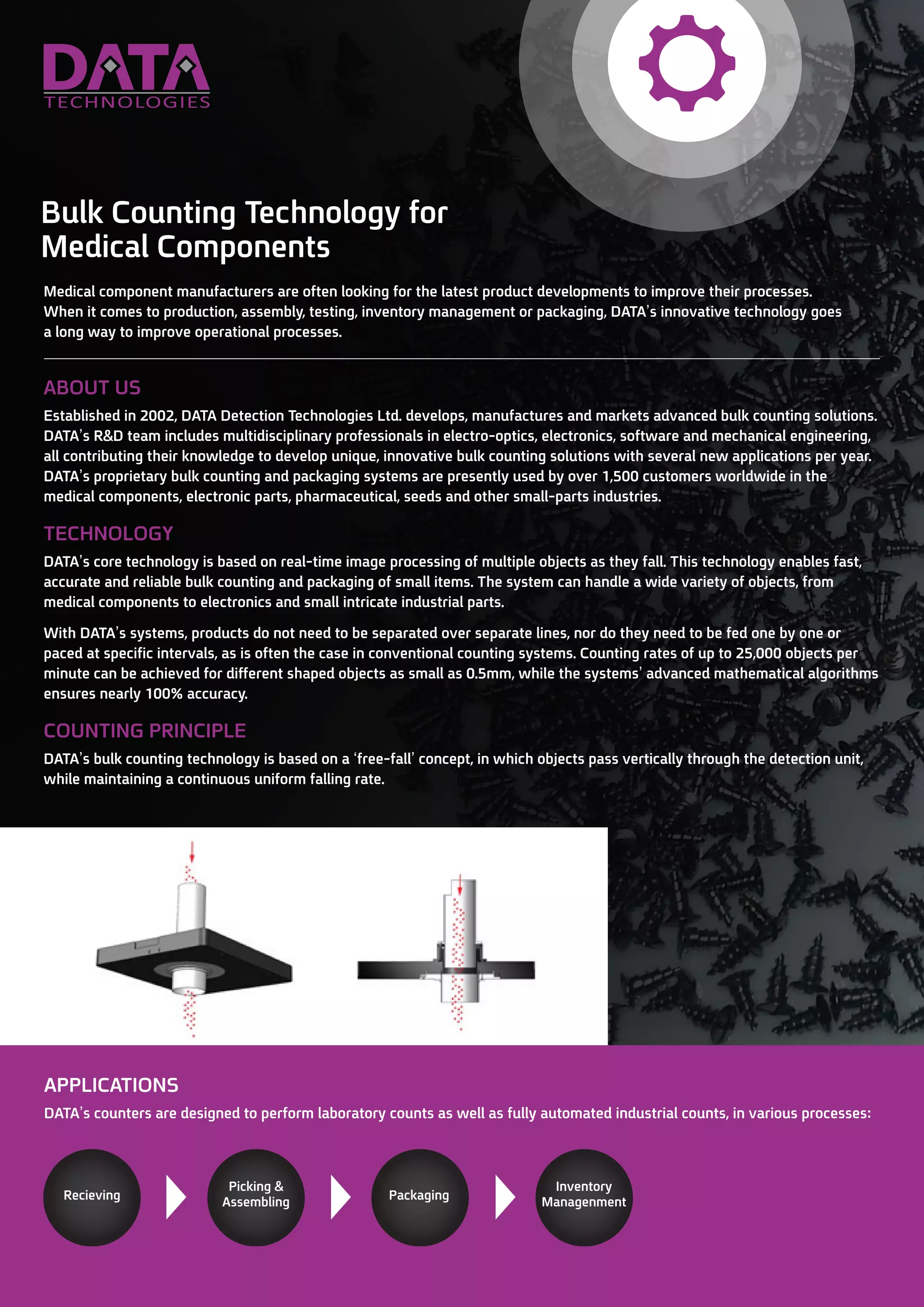 Data Detection Technologies Ltd., established in 2002, specializes in advanced bulk counting solutions that enhance operational processes in various industries including medical components and electronics. Their technology, based on real-time image processing, enables accurate counting of small items at rates of up to 25,000 objects per minute with nearly 100% accuracy. The systems improve efficiency, reduce labor costs, and streamline inventory management by replacing traditional counting methods with automated solutions.