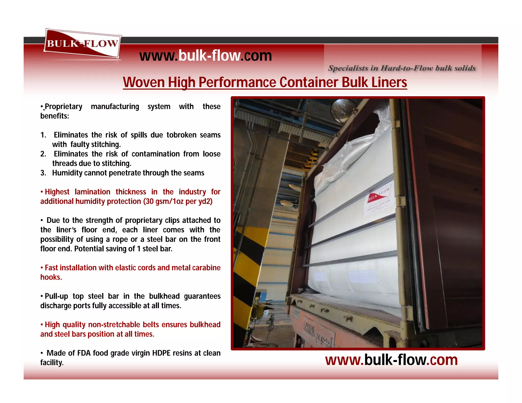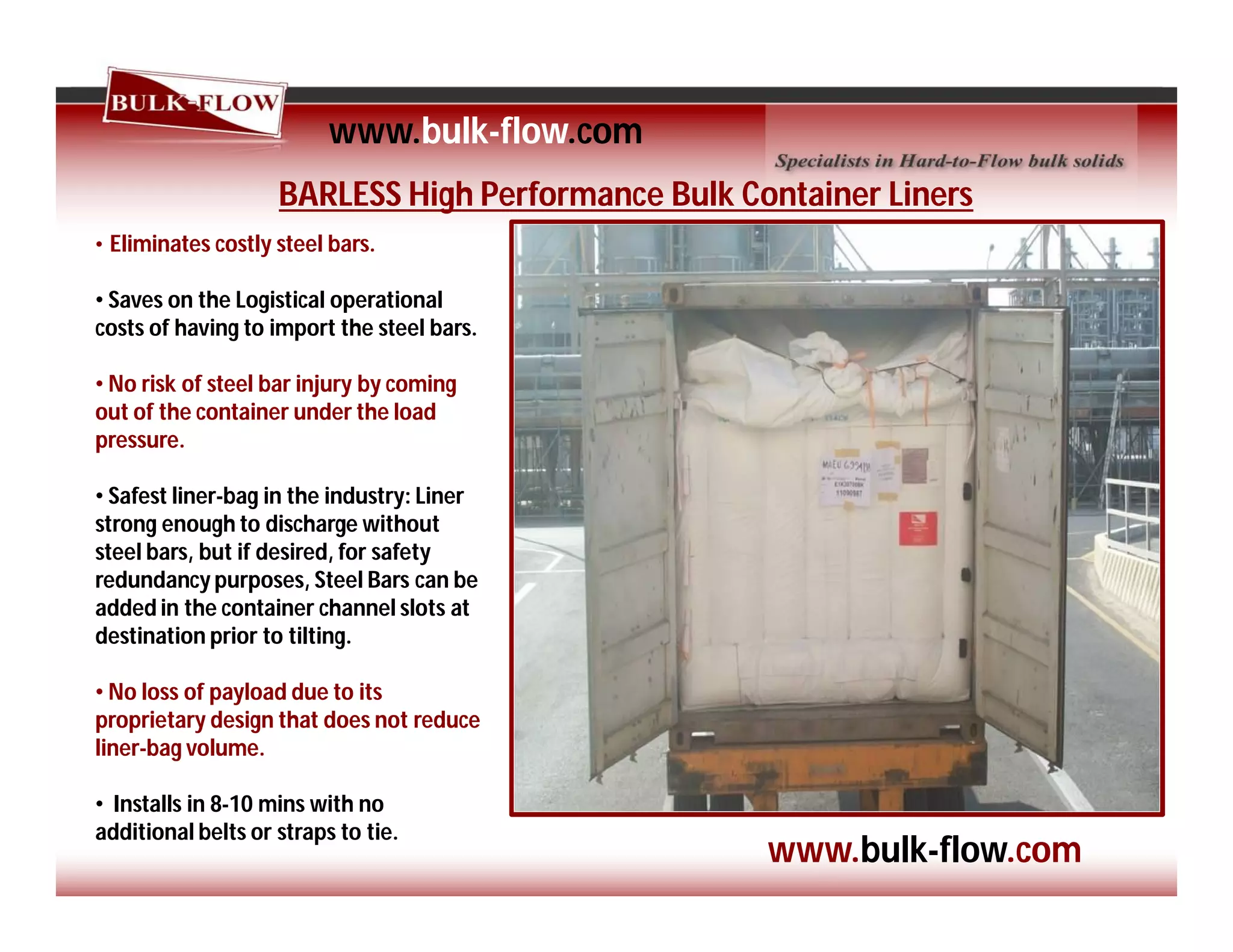 The document describes several types of bulk container liners produced by BARLESS. The BARLESS liners eliminate the need for costly steel bars, saving on logistical and safety costs. They are the safest liners that are strong enough to discharge without steel bars but bars can be added for redundancy. The liners do not reduce payload volume and install quickly. Woven liners eliminate risks from stitching or threads and have high lamination thickness for humidity protection. PE film liners have higher thickness, no external welded seams, and the option to use 4-5 steel bars. They also have a heavy duty bulkhead and proprietary fluidizing system to access discharge ports. All materials are food grade and facilities are clean