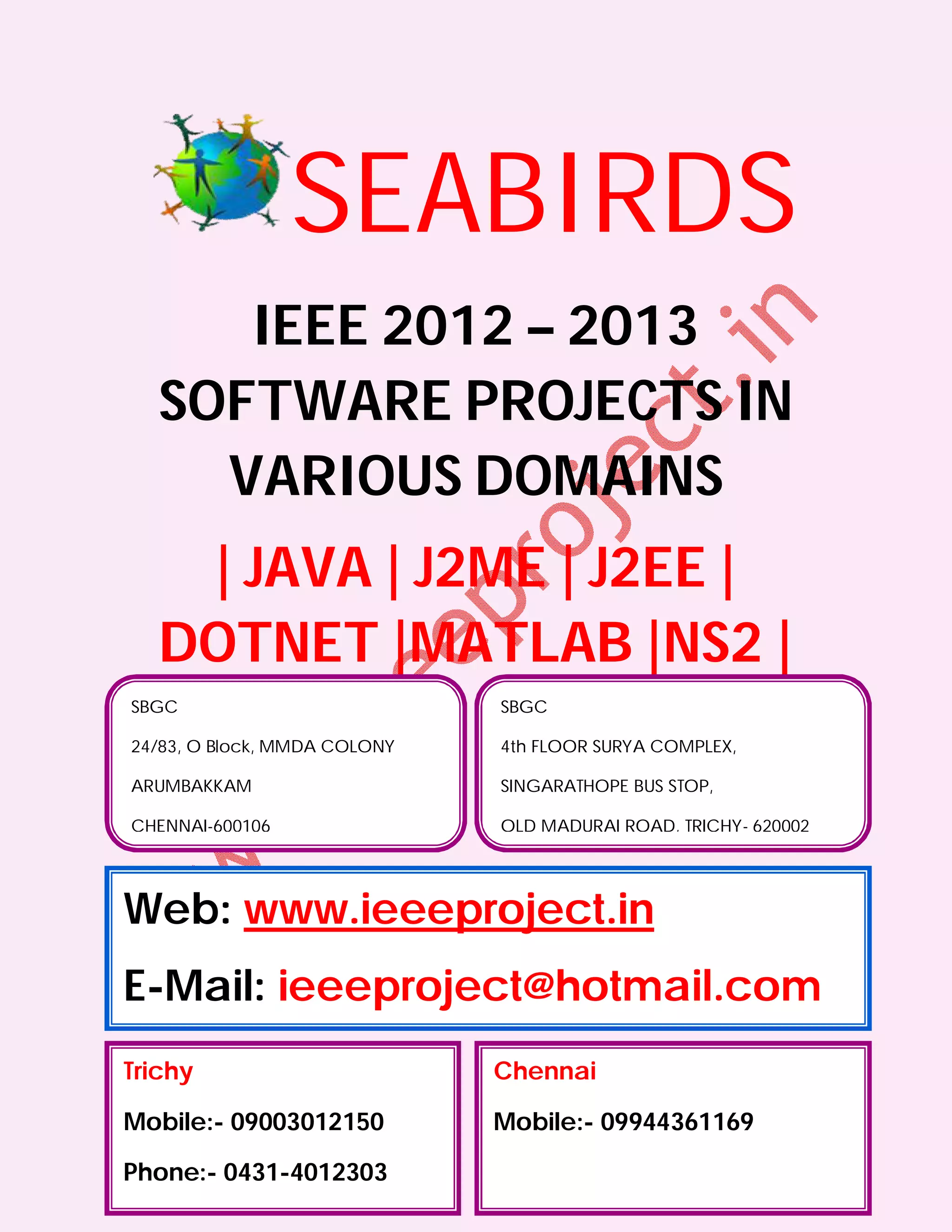 1. The document discusses various IEEE 2012-2013 software projects in domains like Java, J2ME, J2EE, .NET, MATLAB and NS2.