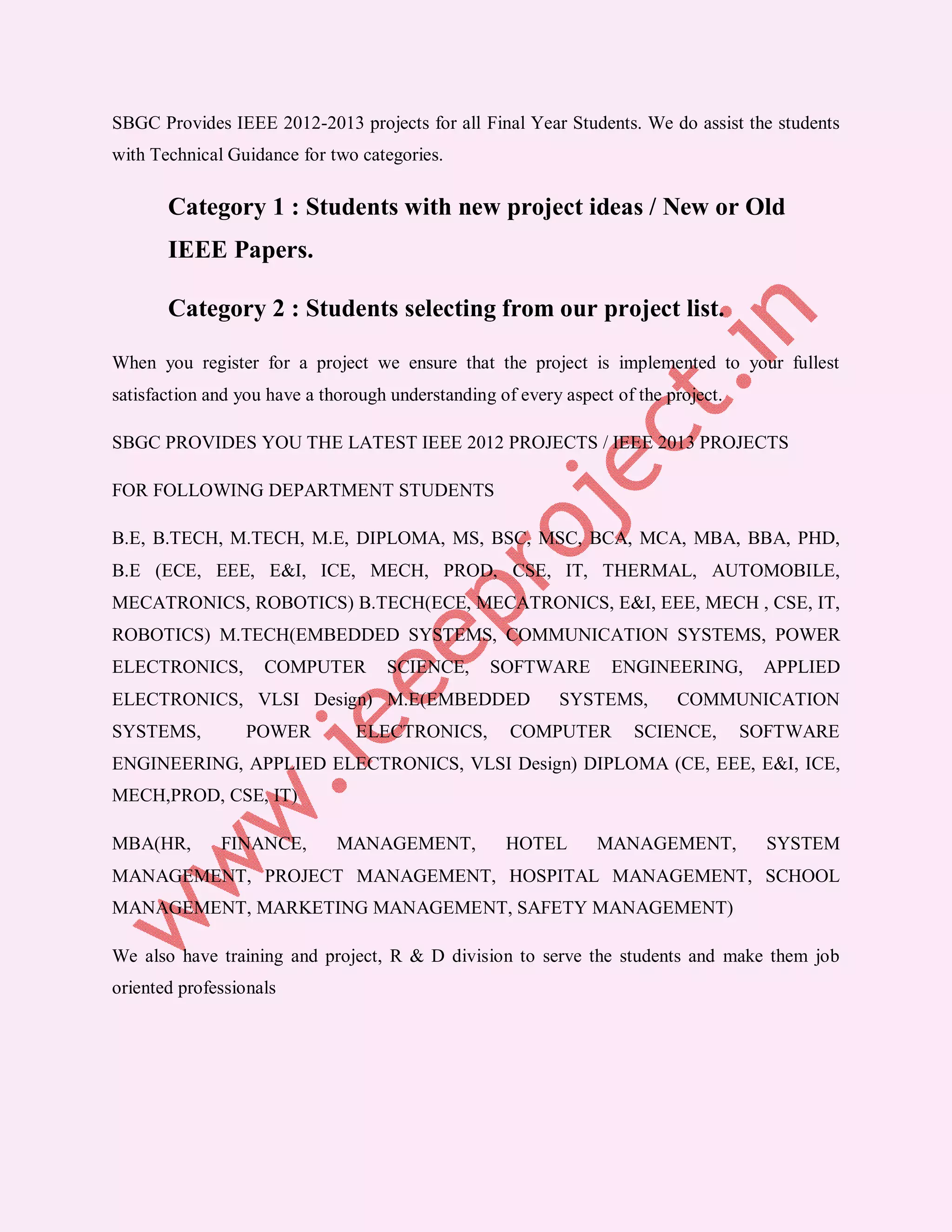 2. SBGC provides technical guidance and support for students' IEEE projects, including project reports, materials, certificates etc.