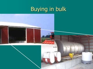 This document provides information on bulk storage requirements for pesticides and fertilizers in Indiana. Farm operations that store over 2,500 gallons of liquid fertilizer or 7,500 total gallons of liquid fertilizer are considered bulk storage. Dry fertilizer stored in piles over 12 tons or dry pesticide stored undivided over 100 pounds is also considered bulk. Facilities storing materials in bulk must register annually with the Indiana State Chemist office and meet containment standards. Primary containment includes labeled storage tanks within secondary containment dikes able to hold the volume of the largest tank. A load pad is also required for mixing, loading and equipment washing activities.
