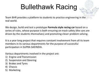 Team BHR is a student project that designs, builds, and tests a prototype Formula-style racing car. The purpose is to provide hands-on engineering experience for students while ensuring safety. Various departments work throughout the year to participate in SUPRA SAEINDIA, including engine/transmission, suspension/steering, brakes/tires, chassis, and marketing. The team can be contacted through their website or Facebook page.