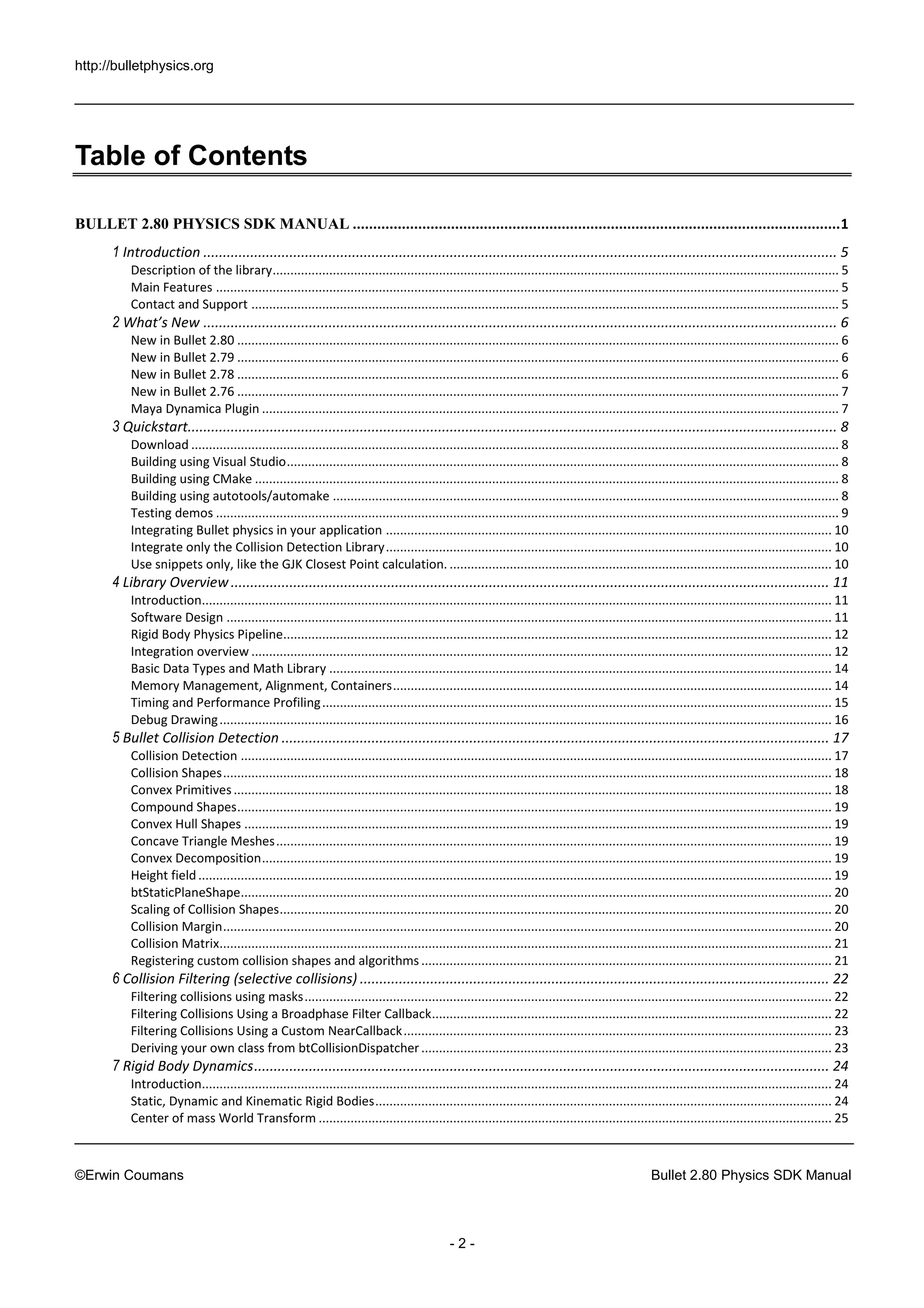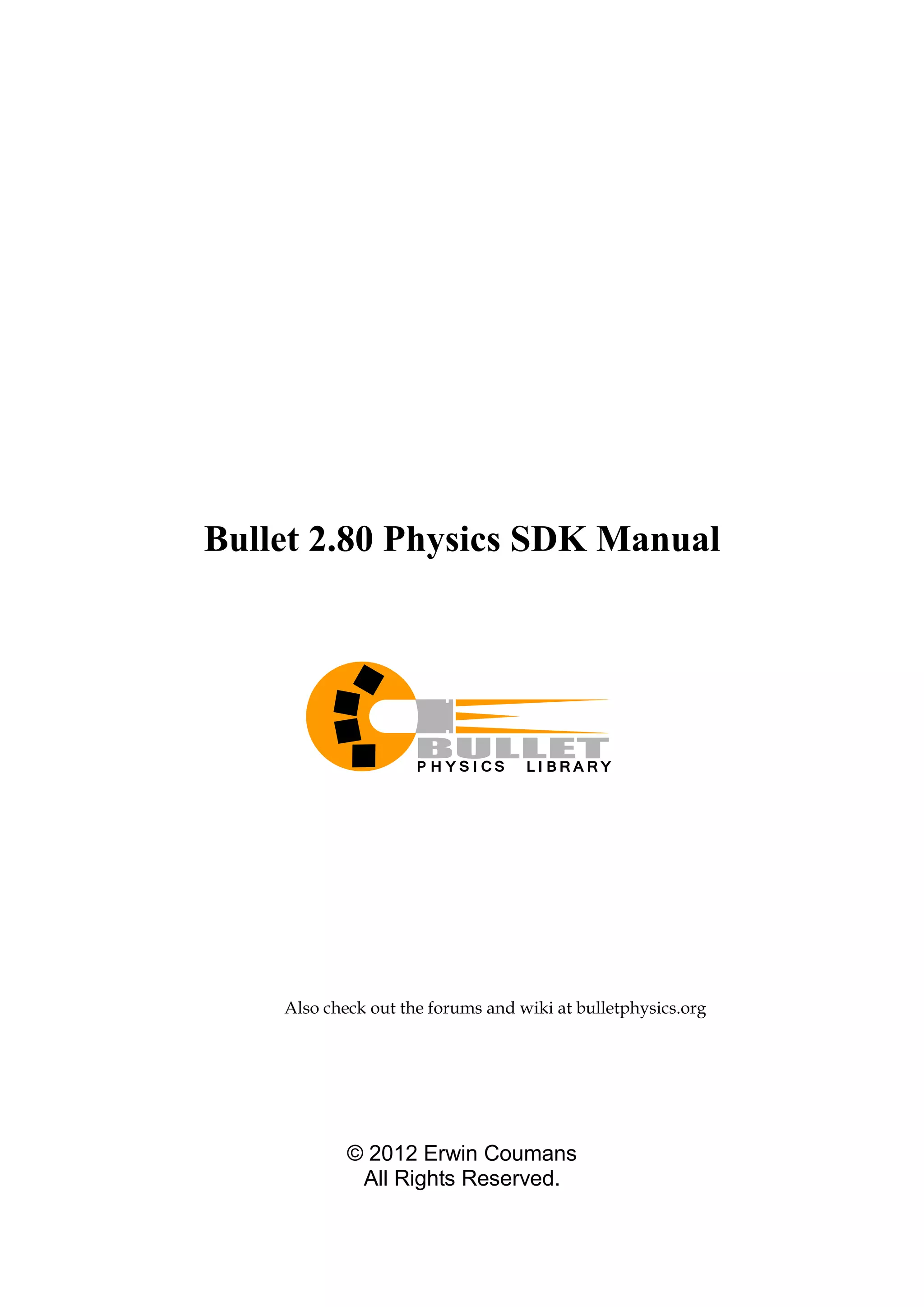 The Bullet 2.80 Physics SDK Manual provides detailed guidance on utilizing the Bullet physics library, which supports collision detection, rigid body dynamics, and soft body dynamics. It includes information about features, installation, integration into applications, and updates from previous versions. Additionally, it outlines library structure, development tips, and links to further documentation and authoring tools.