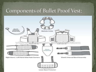 A ballistic vest, also known as a bullet-resistant vest, is designed to absorb impact and protect against projectiles from firearms and shrapnel. The most commonly used material is Kevlar, which is often blended with natural fibers to enhance durability and performance. Vests can vary in layers and are tailored for different users such as police, security personnel, and military forces based on the level of protection required.