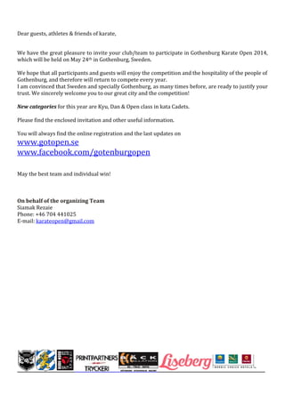 This document announces the Gothenburg Karate Open 2014 competition to be held on May 24th in Gothenburg, Sweden. It invites clubs and teams to register competitors in various kata and kumite categories for youth, cadets, juniors, seniors, and masters. Details are provided on registration, categories, schedules, venues, hotels, and payments. The deadline for registration is May 14th.