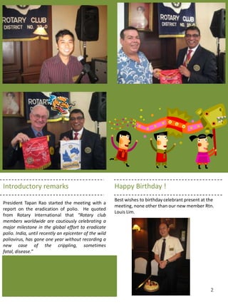 The document is the weekly bulletin of the Rotary Club of Singapore, which provides updates on club activities, including a speaker discussing how humor leads to happiness, the introduction of a new club member, and announcements of upcoming Rotary events in celebration of various months and holidays. The bulletin also recognizes member birthdays and anniversaries, and provides guidance on self-reflection through the four-way test.