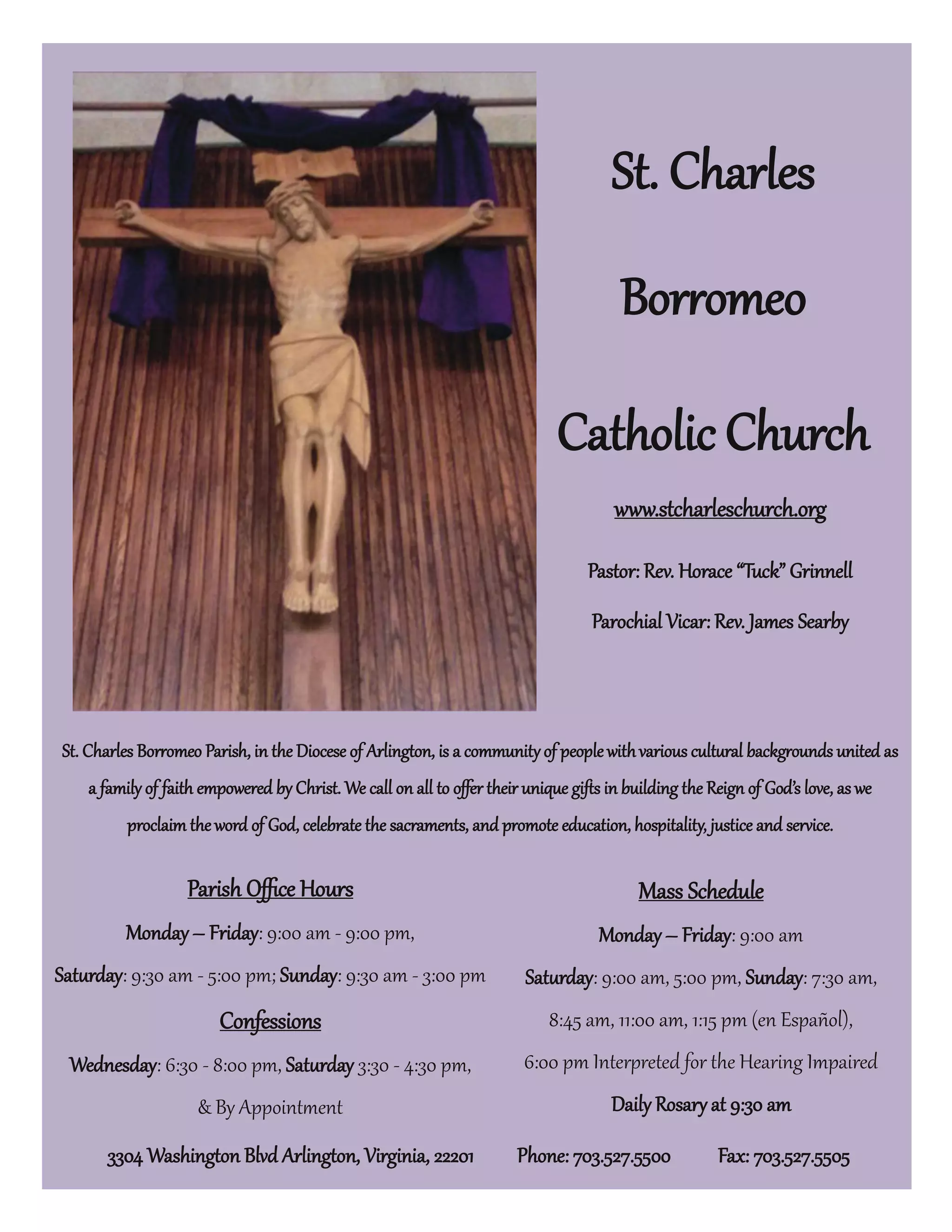 St. Charles Catholic Church in Arlington, Virginia, serves as a community of faith focused on building God's kingdom through sacramental celebrations, education, justice, and service. The church has a range of activities including mass schedules and confession times, and offers various services and resources to parishioners. The document also includes advertisements from local businesses and services relevant to the community.