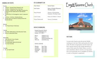 The document provides a schedule of events for Emmett Nazarene Church for the week including Sunday school, worship services, prayer groups, bible studies and activities. It also includes announcements about volunteer needs, prayer requests, mission updates and the church's financial report.