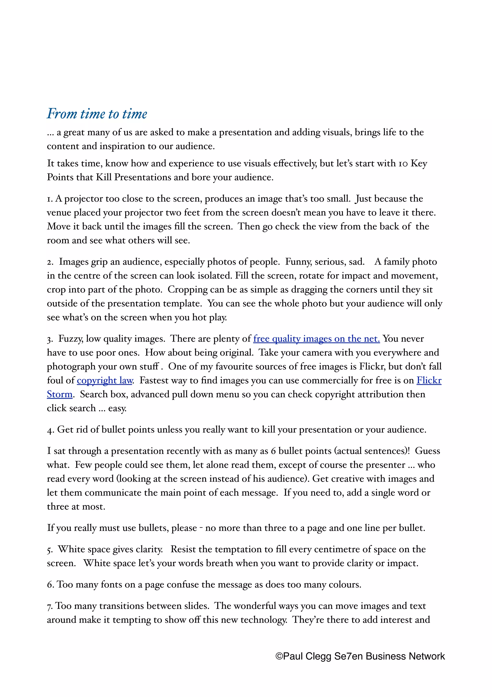 The document outlines ten critical points to enhance presentations and engage audiences effectively. Key recommendations include avoiding bullet points, using high-quality images, limiting fonts and colors, and ensuring good timing and control of audience interaction. By incorporating these strategies, presenters can improve clarity and retain audience interest.