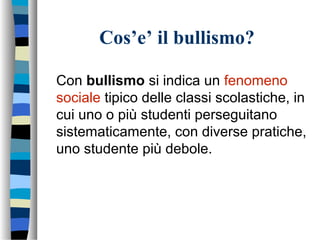 Il documento esplora il fenomeno del bullismo scolastico, definendo il termine e le sue origini, e analizzando le caratteristiche delle vittime e dei bulli. Si sottolinea l'importanza della natura relazionale del bullismo, la sua diffusione nelle scuole e l'inefficacia della risposta degli adulti. Viene inoltre evidenziato il ruolo dei gruppi sociali nella perpetuazione del fenomeno e l'assenza di una correlazione diretta tra bullismo e successo scolastico.