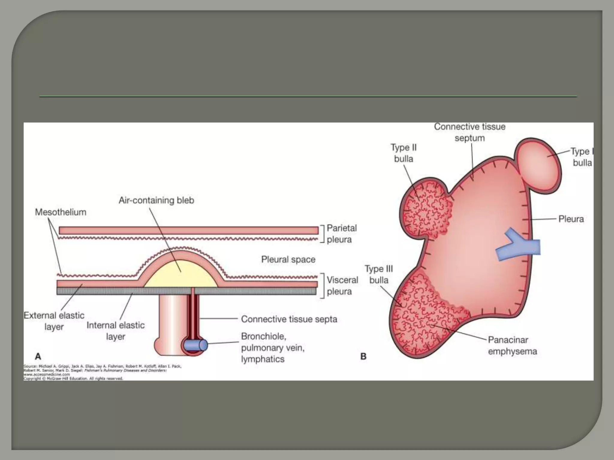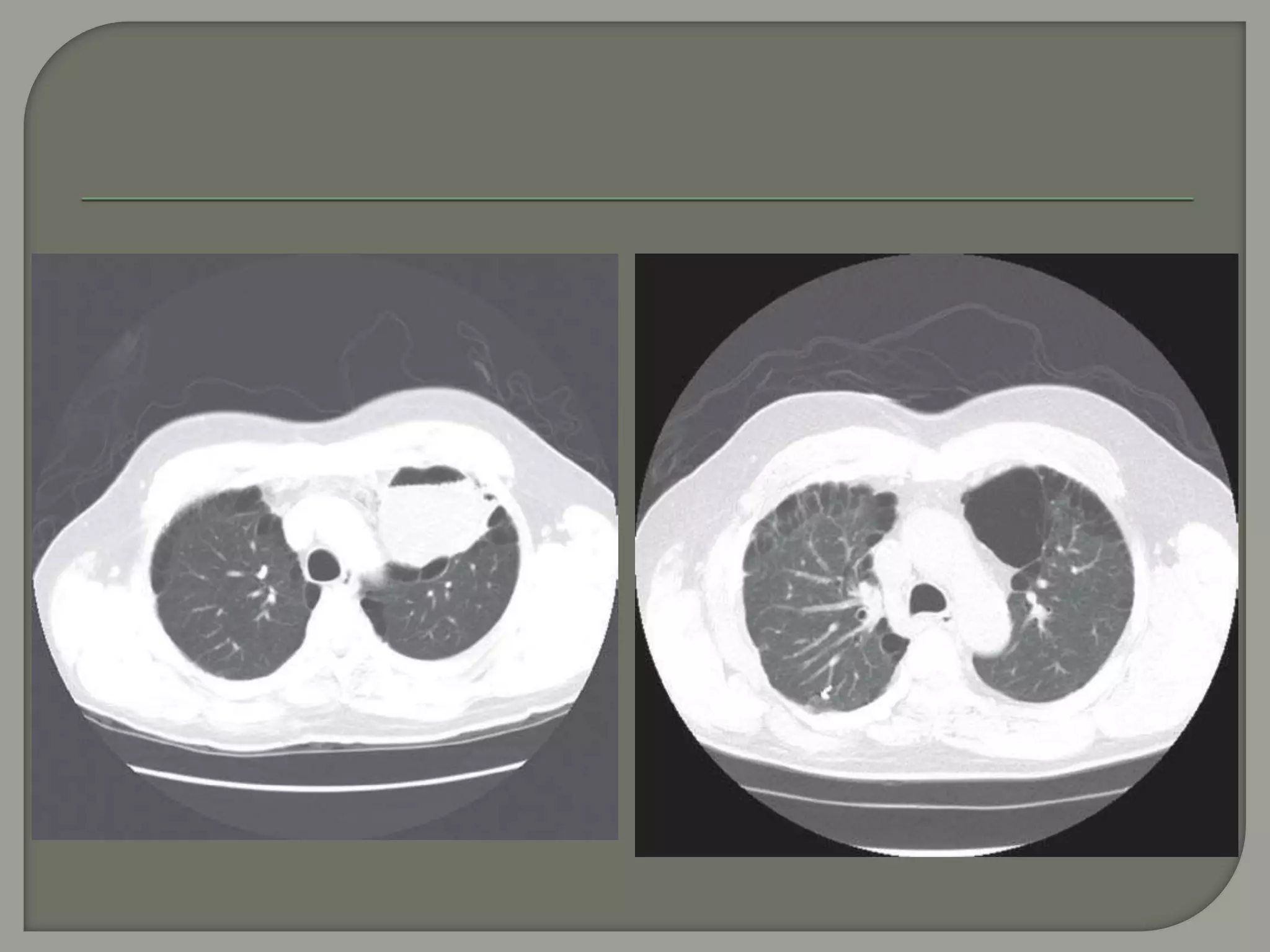 The document discusses the characteristics and clinical contexts of bullae in the lungs, including their formation, types, and associated conditions such as emphysema and pulmonary fibrosis. It outlines diagnostic methods, complications, and treatment options, including bullectomy for severe cases. Management strategies for patients with bullous lung disease, including monitoring and surgical interventions, are also detailed.