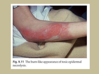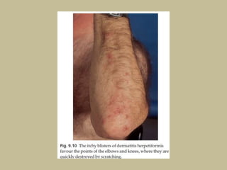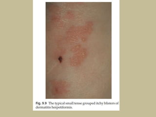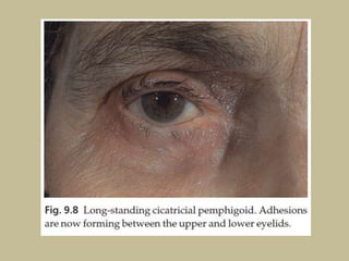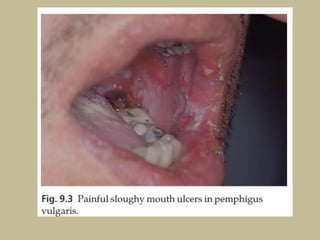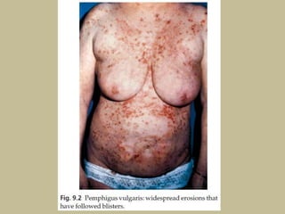 2. It then focuses on three main immunobullous diseases - pemphigus, pemphigoid, and linear IgA bullous disease. Pemphigus is caused by antibodies against desmoglein proteins and features flaccid blisters. Pemphigoid features tense blisters caused by antibodies against basement membrane proteins. Linear IgA bullous disease clinically resembles pemphigoid.