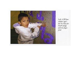 This document provides information and strategies for teaching about tolerance, diversity, and bullying prevention. It defines bullying as ongoing mistreatment involving an imbalance of power. The goals are to create a respectful community and empower students to challenge bigotry. Suggested activities include "Mix it Up at Lunch" day, a diversity display, and student-made videos. Teachers are advised to investigate any bullying situations, show bystanders how to respond, and have an anonymous note box. Working with students, teachers can establish classroom rules against bullying and create an antibullying pledge.