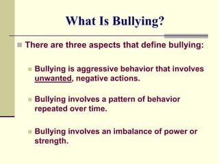 The document discusses bullying in schools and provides definitions and examples of different types of bullying. It identifies characteristics of both bullies and victims of bullying. The document also outlines programs and initiatives implemented by Saugus Public Schools to prevent bullying and help students identify and report instances of bullying. These include anti-bullying assemblies, classroom lessons, newsletters for parents, and guidance counselor training.