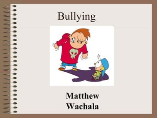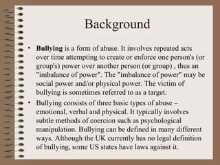 Bullying takes many forms including emotional, verbal, and physical abuse through methods like psychological manipulation. Surveys show that 77% of students report being bullied, with 14% having severe reactions. Bullying has been linked to increased violence, drug and alcohol use, and dropping out of school. Among perpetrators of school homicides, over half reported being bullied themselves, showing the destructive impact of bullying.
