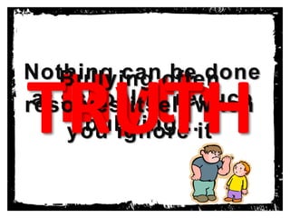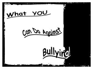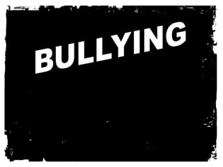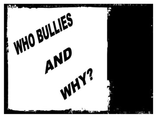 The document defines bullying as any willful attempt or threat to inflict injury on another person. It discusses reasons why some kids bully, including witnessing violence at home, having trouble following rules, or seeking control and power over others to make themselves feel better. The document also provides tips on how to identify bullies based on their behaviors, what bullies look for in victims, and advice for kids on how to respond to bullying, including telling an adult and not fighting back.