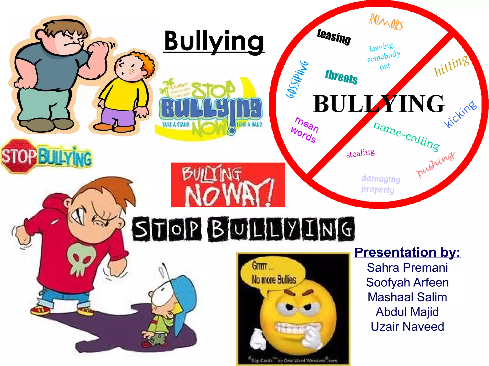 The document discusses bullying as a form of abuse characterized by the intentional use of negative actions or words by someone with more power, leading to distress for the victim. It outlines types of bullying such as physical, verbal, social, psychological, and cyber bullying, and distinguishes bullying from teasing. The document also highlights the negative effects on both victims and bullies, and describes initiatives taken by a school to combat bullying, emphasizing the need for collective action to eliminate this behavior.