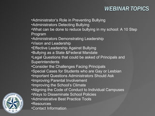 The document provides guidance for school administrators on preventing bullying. It discusses the administrator's role in detecting and addressing bullying, including implementing a 10-step program. Administrators are advised to demonstrate leadership, be aware of legal mandates around bullying, improve parental involvement, and utilize evidence-based resources and tools to address bullying on their campuses. Key responsibilities include making anti-bullying policies clear, investigating all reported incidents, and working with teachers to incorporate anti-bullying lessons.