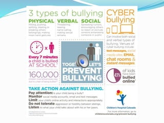 Bullying has become a serious national problem, affecting about 1 in 3 students. While bullying used to consist of physical acts like hitting or pushing, today's technology allows bullying to also occur online, known as cyberbullying. Heavy exposure to media that glamorizes bullying can negatively impact viewers' perceptions of social reality. Many adults still view bullying as a normal part of childhood, but it has serious consequences for victims, including an increased risk of suicide. Despite growing awareness and efforts to address bullying, the rates of reported bullying have been increasing in some areas. To truly address the problem, society must work to stop tolerating and perpetuating bullying behaviors.