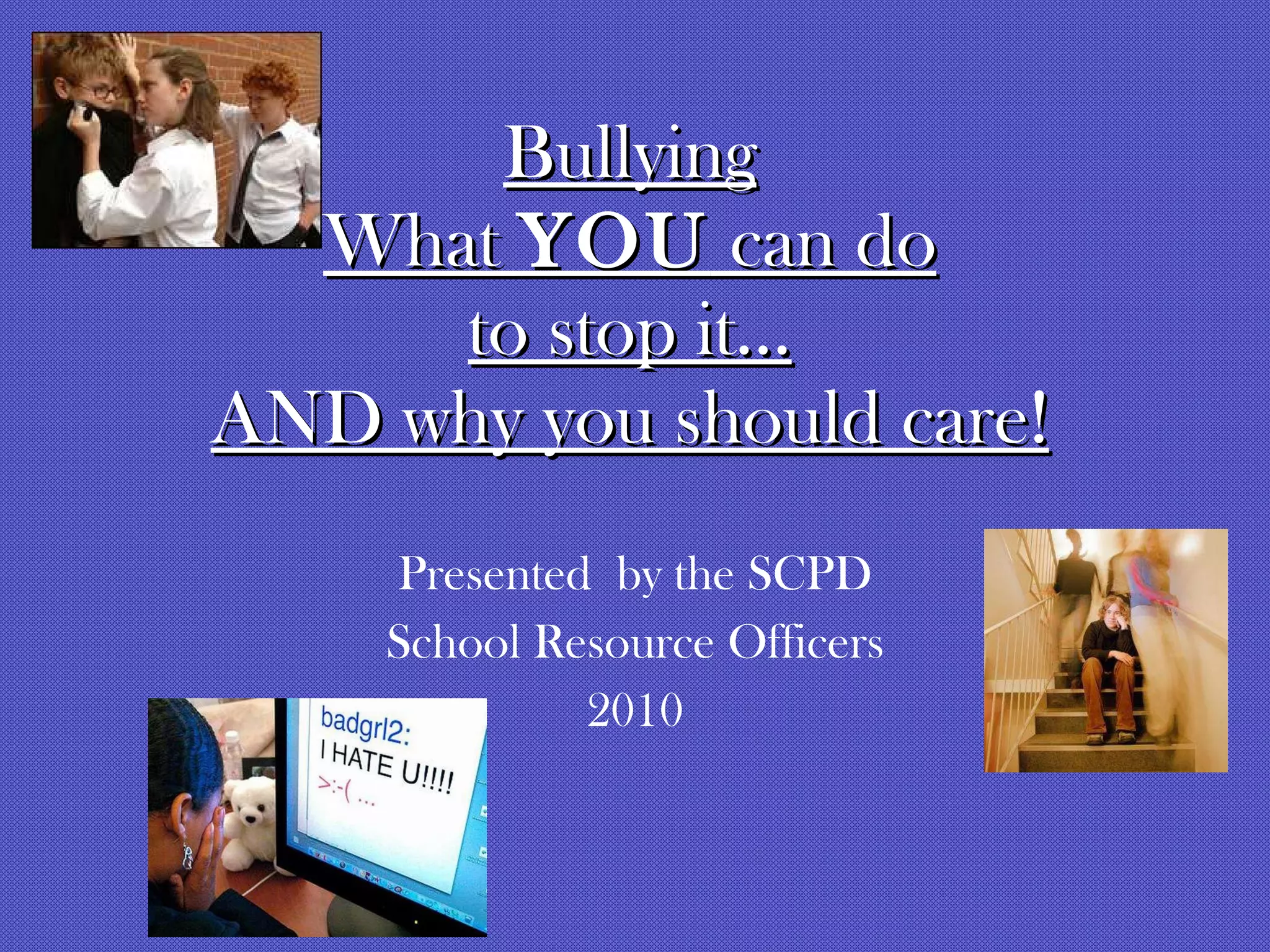 This document discusses bullying and provides information on how to stop it. It defines bullying as treating someone abusively through force or coercion. There are three main components - repeated negative actions intended to harm with an imbalance of power. The document outlines different forms of bullying including physical, verbal, relational, and cyber bullying. It discusses the effects of bullying on victims and provides statistics on bullying in Minnesota schools. It encourages intervening when witnessing bullying and outlines potential consequences for engaging in bullying behavior.