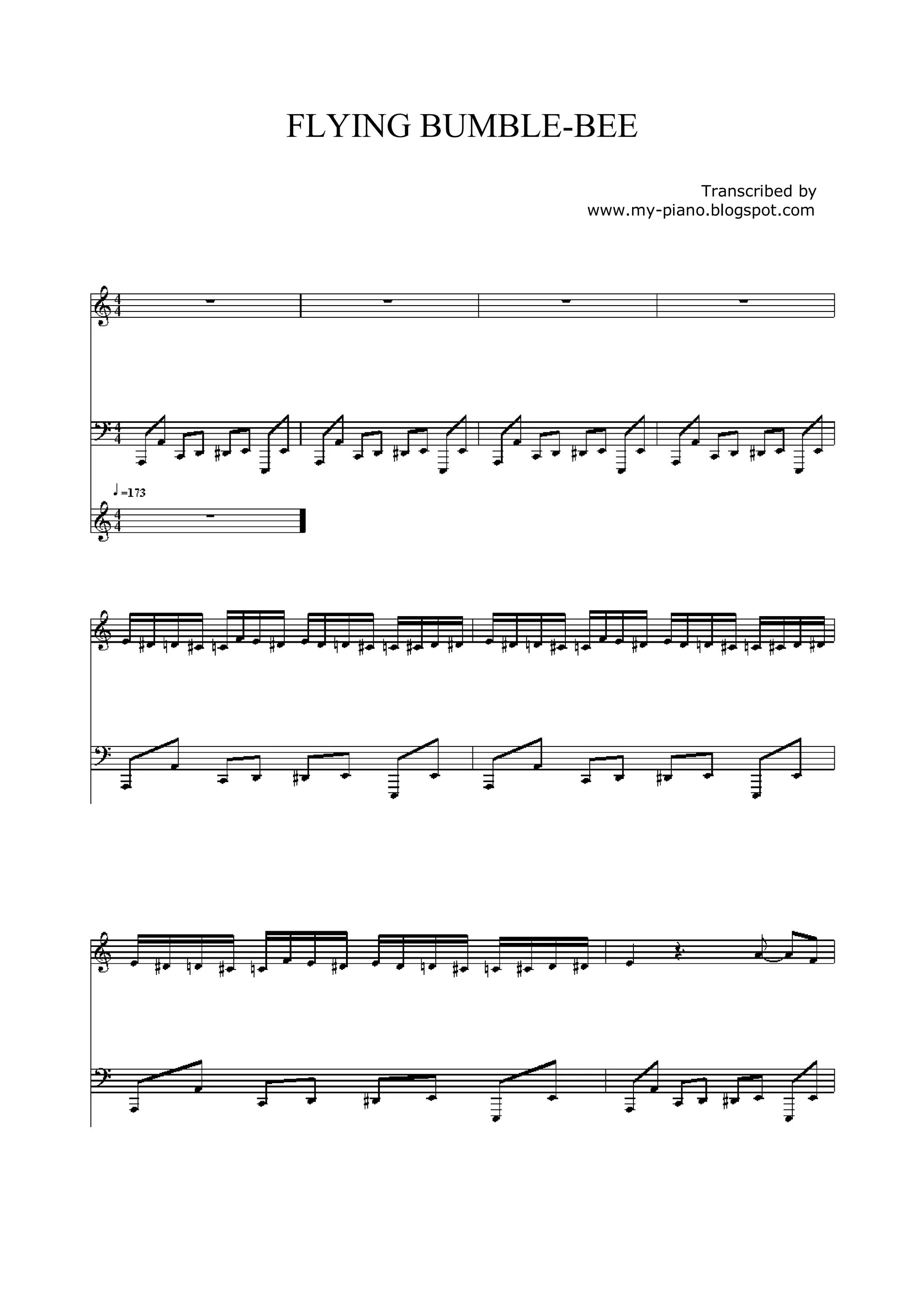 This document is a piano transcription of the song "Flying Bumble-Bee". It contains the sheet music for the song broken down into measures. The transcription was done by www.my-piano.blogspot.com and aims to allow people to play the song on piano by providing the musical notation.