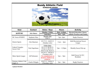 KIPP/DC uses Bundy Athletic Field Monday through Friday from 8am to 6:45pm for physical education classes, athletic practices, and games. They also use the field on Saturdays from 8am to 1pm. The field is also used by various soccer, rugby, and recreational sports leagues on specific dates from March through August 2013.
