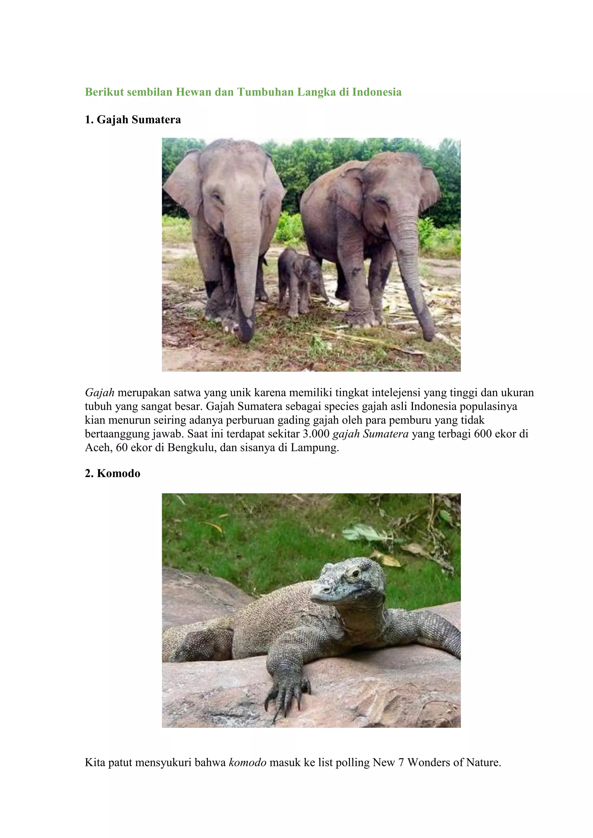 Dokumen tersebut membahas 9 hewan dan tumbuhan langka di Indonesia, termasuk Gajah Sumatera, Komodo, Rafflesia Arnoldi, Mangga Kasturi, Harimau Sumatera, Orang Utan, Kantong Semar, Tanaman Bayur, dan Badak Jawa. Semua spesies tersebut terancam punah karena kehilangan habitat.