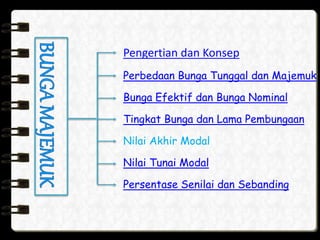 Dokumen ini menjelaskan konsep perbedaan antara bunga tunggal dan bunga majemuk, serta memberikan rumus perhitungan untuk kedua jenis bunga tersebut. Contoh perhitungan tingkat bunga efektif dan nilai diskonto juga disertakan. Selain itu, dokumen ini mencakup cara menentukan tingkat bunga bulanan yang ekuivalen dengan tingkat bunga tahunan.