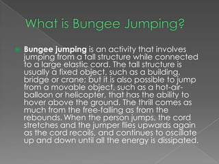 Bungee jumping involves jumping from a tall structure while connected by an elastic cord to a harness. The thrill comes from both the free fall and rebounds as the jumper oscillates up and down until the cord loses energy. There are different styles of jumps including back dives off bridges, jumps from hot air balloons or helicopters, and tandem jumps with multiple people attached to the same cord.