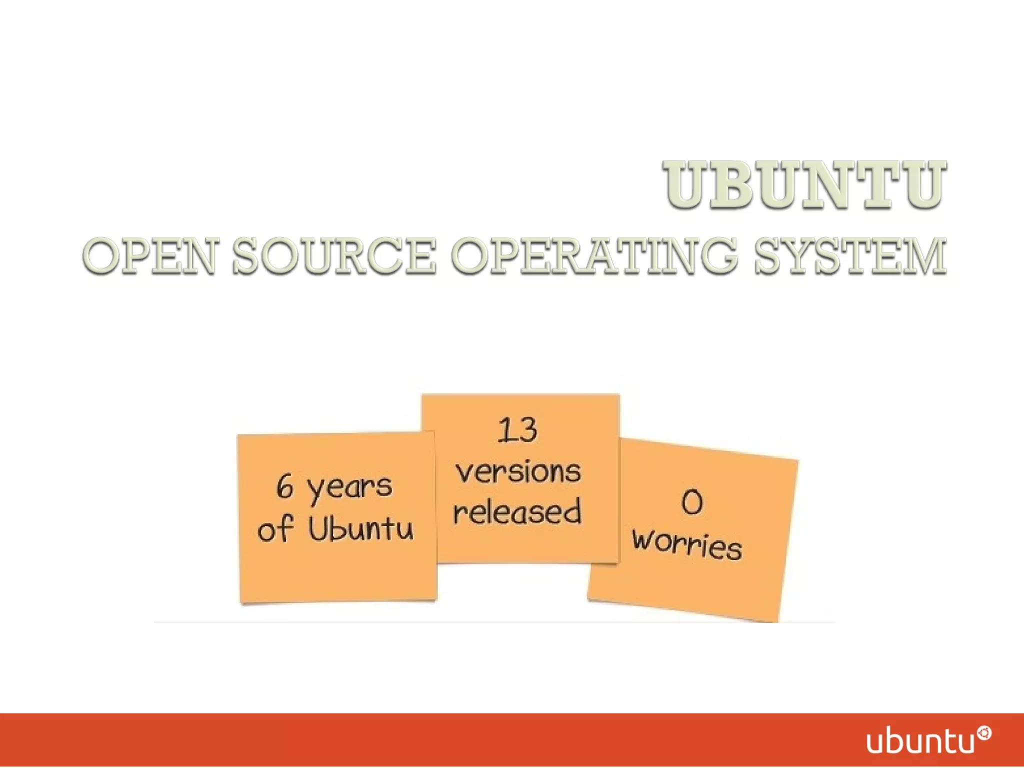 The document is about the Ubuntu operating system. It discusses that Ubuntu is a popular Linux distribution that is open-source and free to use. It focuses on usability and easy installation. Ubuntu is developed by Canonical Ltd. and is based on Debian Linux. It requires minimal hardware resources and provides various desktop environments to choose from. Ubuntu also includes a large library of free, open-source software and regular, free software updates.