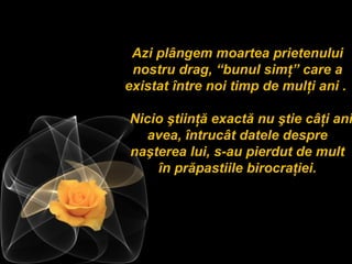 Documentul plânge dispariția bunului simț, subliniind valorile esențiale pentru societate, cum ar fi responsabilitatea și respectul. Se evidențiază cum reguli bine intenționate au dus la declinul acestuia, punând în pericol educația și disciplina. În final, se face apel la cei care își amintesc de bunul simț să-i onoreze memoria prin acțiuni pozitive.