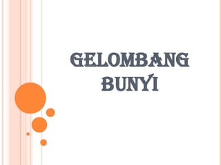 Dokumen tersebut memberikan informasi tentang bunyi dan gelombang bunyi, mencakup sifat bunyi, karakteristik bunyi, cepat rambat bunyi, bunyi pantul, kualitas suara, spektrum suara, dan reproduksi suara serta kebisingan. Dokumen tersebut juga memberikan contoh manfaat gelombang bunyi.