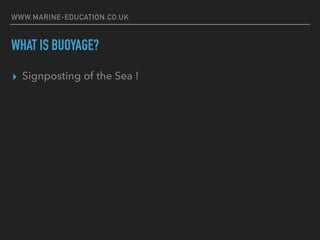 This document discusses buoyage systems which are used to mark navigational routes and hazards at sea. It describes the two main buoyage regions, IALA A and B, which differ only in their use of lateral marks to mark channels. The document provides details on the types of buoys used, including lateral, cardinal, special, emergency wreck, isolated danger, and safe water buoys. It explains what each type of buoy indicates and their distinctive light sequences to help ships navigate safely.