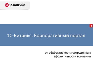 Документ описывает корпоративный портал 1С-Битрикс, который обеспечивает эффективное управление задачами, документами и коммуникацией сотрудников. Включает функции обмена файлами, внутренние сообщения, вики, видеозвонки и социальные коммуникации через интерактивную 'живую ленту'. Портал предлагает интеграцию с различным ПО и поддерживает многодепартаментность для повышения производительности.