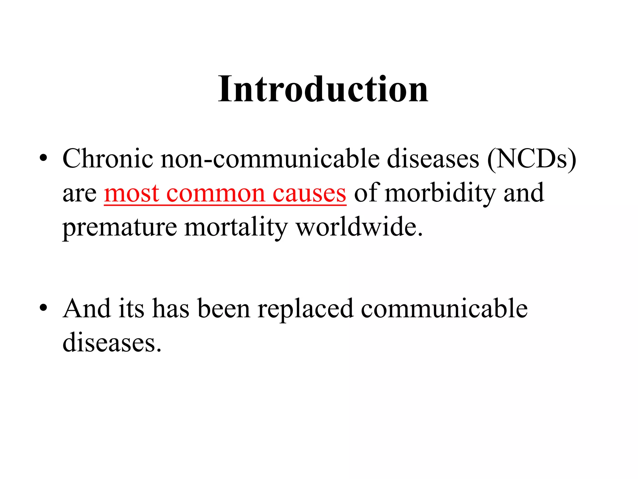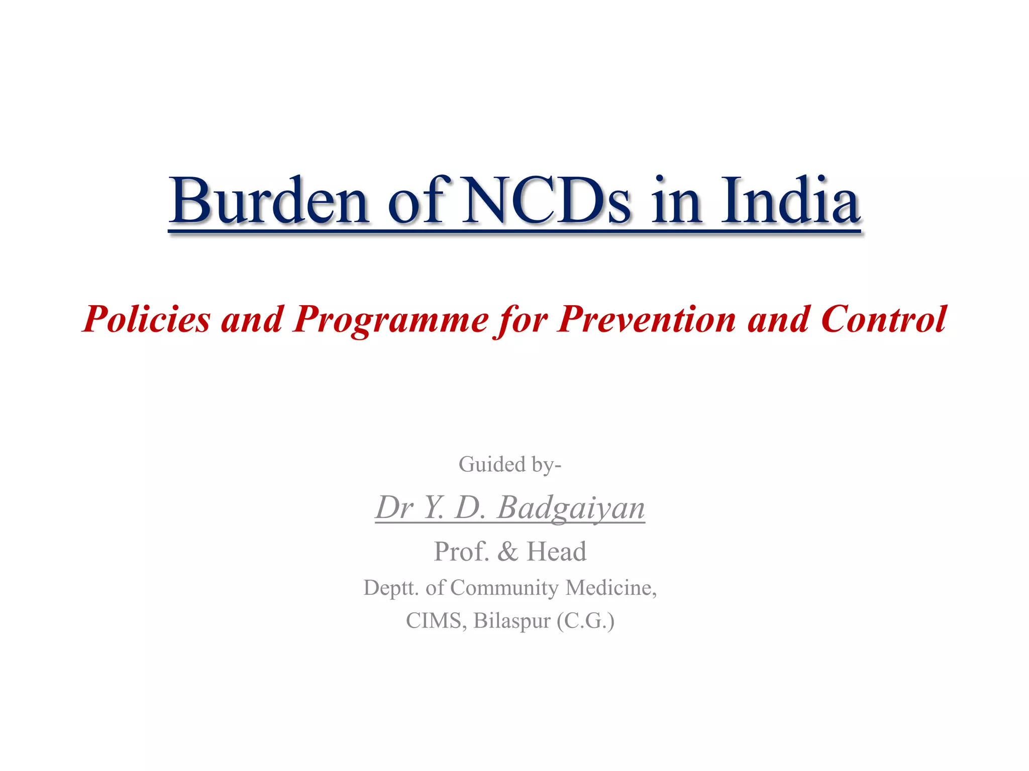 Chronic non-communicable diseases (NCDs) such as cardiovascular disease, cancer, and diabetes now account for over half of deaths in India and place a large economic burden. The National Programme for Prevention and Control of Cancer, Diabetes, CVD and Strokes (NPCDCS) aims to address NCDs through health promotion, screening, diagnosis, management, and capacity building integrated into primary healthcare. Current programs have had limited implementation; a comprehensive and widespread approach is still needed to reduce the growing NCD burden in India.