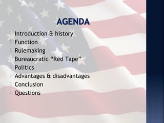 This document provides an overview of the key topics covered in the BUS 4010 Introduction to Public Administration course. The course covers the history and functions of public administration, the rulemaking process, bureaucratic red tape, the influence of politics, and the advantages and disadvantages of bureaucracy. It also examines Max Weber's theory of bureaucracy and the characteristics of bureaucratic organizations, such as hierarchical authority, task specialization, extensive rules, and impersonality. Common criticisms of bureaucracy like red tape are also discussed.