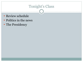 The document discusses Chapter 13 on the bureaucracy. It provides an overview of the key topics in the chapter, including why Congress allows bureaucratic rulemaking, potential conflicts with this system, models of bureaucracy like the Weberian model, and modern attempts at bureaucratic reform through initiatives like deregulation, privatization, and whistleblower protections. It also addresses the size and organization of the federal bureaucracy along with congressional control over bureaucratic agencies and departments.