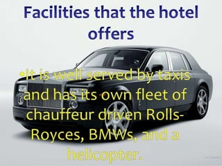 The Burj Al Arab is a luxury hotel located in Dubai, United Arab Emirates. Built from 1995-1999 at a cost of $650 million, it is shaped like a sail and stands 321 meters tall. With 202 rooms and 60 floors, it is one of only two 7-star hotels in the world and features an underwater restaurant, the world's tallest atrium, and the world's highest tennis court.