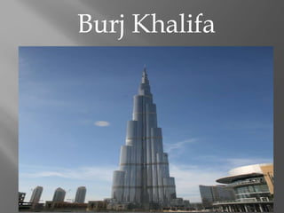 Burj Khalifa is the tallest building in the world located in Dubai, United Arab Emirates, standing over 800m tall and containing 30,000 homes, 9 hotels, at least 19 towers, gardens and a lake.