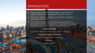 The Burj Khalifa tower project in Dubai aimed to build the world's tallest skyscraper at a cost of $1.5 billion. It was developed by Emaar Properties and constructed by a joint venture including Samsung, Besix, and Arabtec. Over its six-year construction from 2004 to 2009, the tower reached various milestones and set new records, including topping out at 828 meters tall and 164 floors upon completion. The project finished on schedule and on budget.