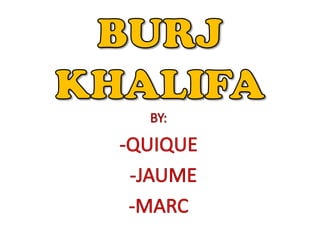 Burj Khalifa is the tallest building in the world at 829.8 meters tall with 163 floors. It is a skyscraper located in Dubai that was built from 2004 to 2010 and features an hotel and other facilities. The architect firm Skidmore, Owings, and Merrill designed Burj Khalifa, which had a grand opening ceremony on January 4, 2010 involving 10,000 fireworks.