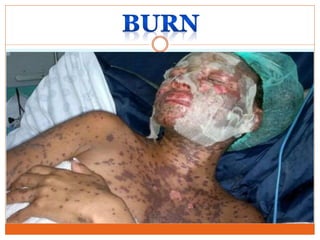 This document provides information on burns including definitions, causes, classifications, management, and complications. It defines a burn as an injury caused by heat, cold, electricity, chemicals, friction or radiation. Burns are classified based on depth (partial thickness or full thickness) and extent (percentage of total body surface area affected). Management involves addressing airway, breathing, circulation, fluid resuscitation, wound care including cleaning, dressing and grafting, pain management, nutrition, and rehabilitation. Complications can include shock, infection, scarring and long term psychological impacts.