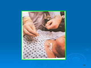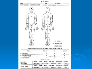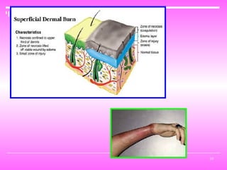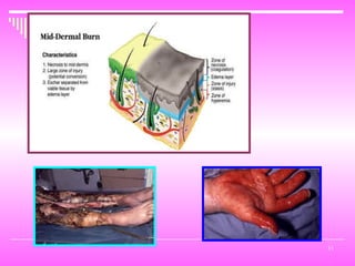 Burn and scald injuries can be caused by heat, electricity, chemicals, or radiation. Thermal burns are the most common and are classified as superficial, partial thickness, or full thickness depending on the depth of tissue damage. A severe burn over 25% of the total body surface area can cause systemic effects like shock due to fluid loss, decreased blood pressure, and increased heart rate. Complications include infection, respiratory failure, renal failure, and contractures. The severity of the burn is estimated using methods like the Rule of Nines or Lund and Browder chart which divide the body into sections and assign a percentage of total body surface area to each.