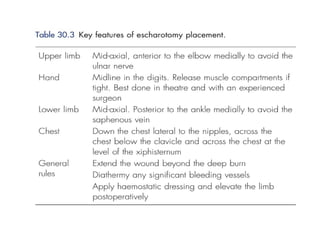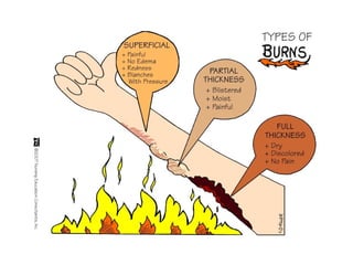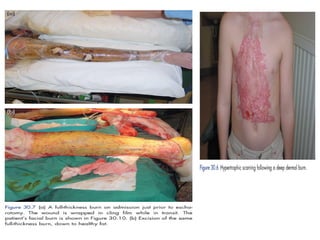 Burn injuries primarily affect the skin but can also damage the airway and lungs, leading to life-threatening complications if not treated properly. Immediate care involves stopping the burning process, cooling the wound, and assessing for inhalational injuries, with specific criteria for acute admission to a burns unit. Treatment includes fluid resuscitation, wound management, infection control, and, if necessary, surgical interventions for deeper burns.