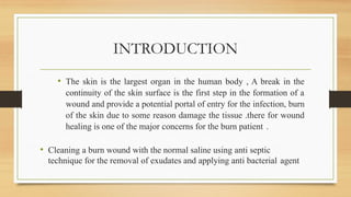 The document outlines the principles and methods for dressing burn wounds, emphasizing the importance of wound cleaning and infection prevention. It describes two dressing techniques: open and closed methods, detailing their advantages and disadvantages. Additionally, it includes procedural steps for applying dressings, nursing responsibilities, and various topical antimicrobial agents used for treatment.