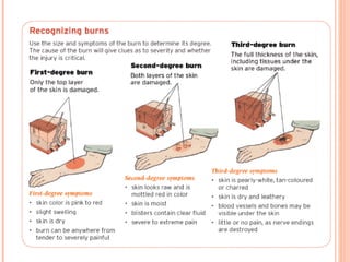 This document discusses different types of burns including thermal, chemical, electrical, and radiation burns. It describes how burns are assessed based on depth and extent of body surface area involved. First, second, and third degree burns are defined. Fluid imbalances that can occur with burns are also outlined. The phases of burn injuries - emergent, acute, and rehabilitative - are summarized along with goals, nursing interventions, and considerations for each phase. Wound care including dressing changes and skin grafting is also covered at a high level.