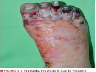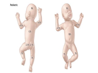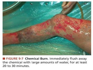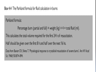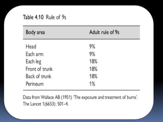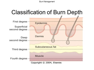 This document provides information on burn management in the emergency department. It discusses the anatomy of skin, the functions of skin, definitions and causes of burns. It describes methods for clinically assessing burns including estimating burn size, depth and location. Management of burns is outlined including ABCs, wound care, fluid resuscitation, monitoring for complications. Specific types of burns - electrical, chemical and their features and management are explained in detail. Factors requiring transfer to a burn center and discharge criteria are highlighted.