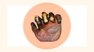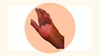 The document outlines the types, causes, and classifications of burns, including thermal, chemical, electrical, radiation, and inhalation injuries, as well as their pre-hospital care and medical management. It details the clinical manifestations associated with burns, such as fluid and electrolyte imbalances, cardiac alterations, and pain, while describing the phases of burn treatment from the emergent phase to rehabilitation. Comprehensive management strategies, including fluid resuscitation, pain control, infection prevention, and the use of topical antimicrobial therapy, are emphasized for effective treatment of burn victims.