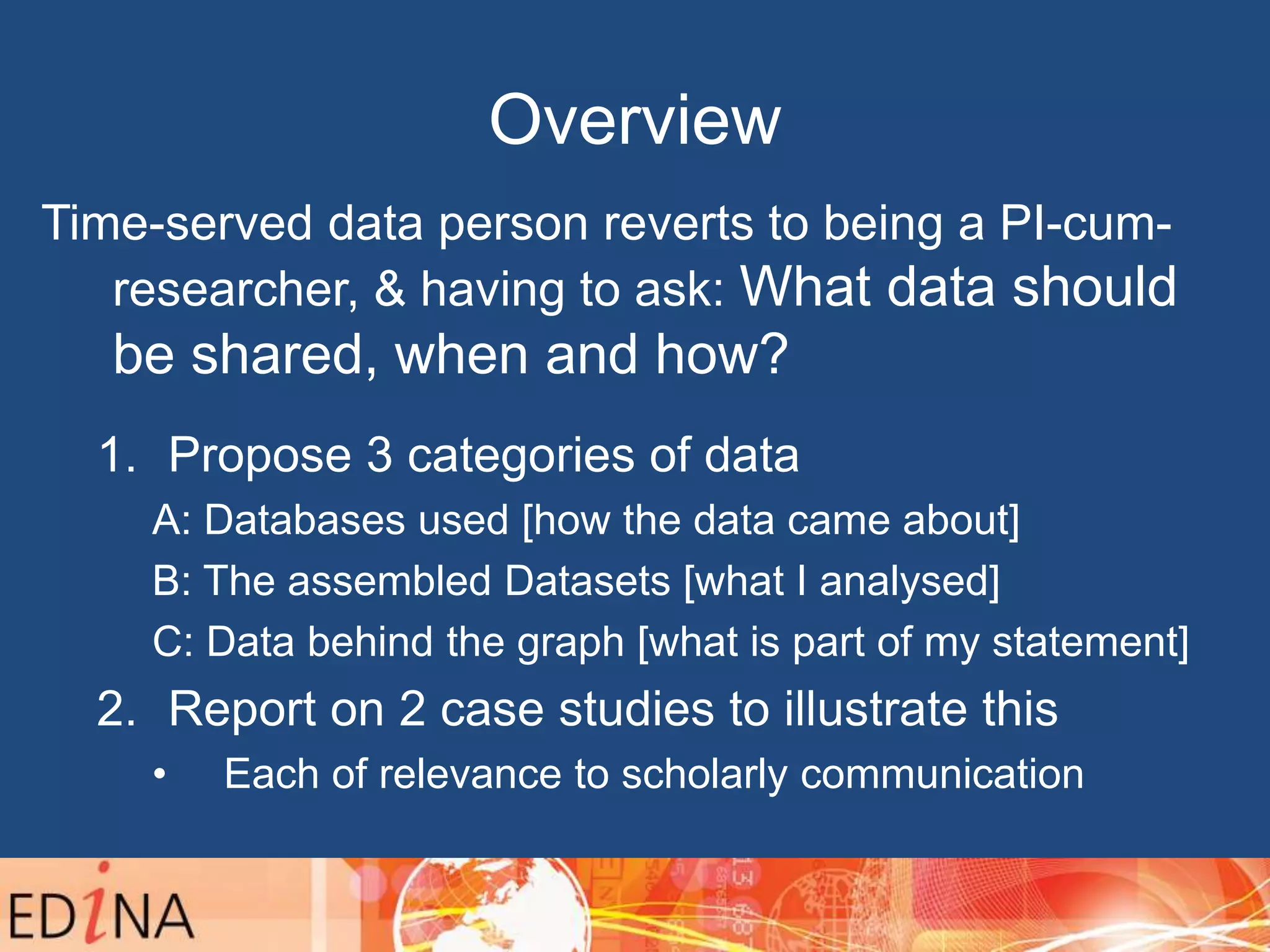 The document discusses the significance of publishing research data, categorizing it into three types: databases, assembled datasets, and underlying data behind published statements. It highlights case studies from Scottish educational archives and addresses issues like reference rot and the integrity of scholarly records in a digital context. The findings emphasize the need for proactive measures in data archiving and sharing to preserve scholarly communication and prevent loss of access.