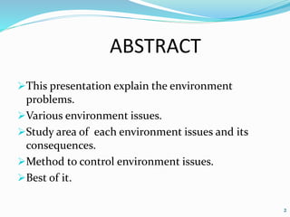This document discusses various types of environmental issues including air, water, soil, and radioactive pollution. It provides examples of each type of pollution, describing the causes and health effects. The types of air pollution include those from industries, automobiles, and coal burning, which can increase cancer and lung disease rates. Water pollution stems from industrial effluents and power plants, decreasing water quality. Soil pollution is caused by industrial waste, fuel leakage, and bad management. Radioactive pollution originates from nuclear power, testing, and mining, potentially leading to cancer. The conclusion advocates preventing land degradation and using environmentally friendly practices to reduce negative environmental impacts.